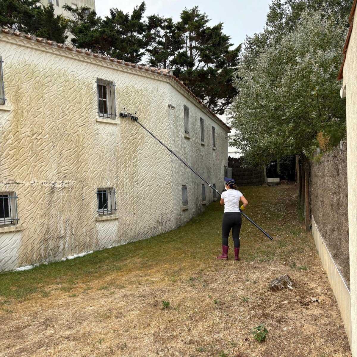 Sur ce chantier, la façade de maison individuelle était envahie par un champignon et des traces verdâtres liées à l’humidité. Après un grattage localisé puis l’application d’une pulvérisation à basse pression avec un traitement fongicide professionnel, les dépôts ont été éliminés en profondeur.